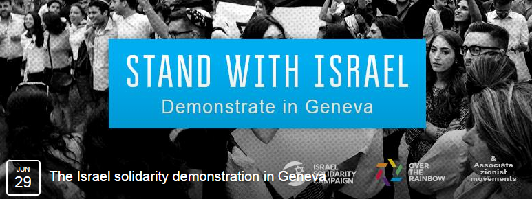 Atsižvelgdami į pastaruoju metu vykstančius šmeižikiškus išpuolius prieš Izraelio valstybės teisėtumą, mes, žemiau pasirašiusios organizacijos, ketiname surengti protesto mitingą, kuriuo paremsime Izraelį. Visus, kurie gerbia žmogaus teises ir demokratiją, mes kviečiame prisijungti prie mūsų birželio 29d. nuo 12:00 iki 15:00val. Ženevoje Place des Nations.