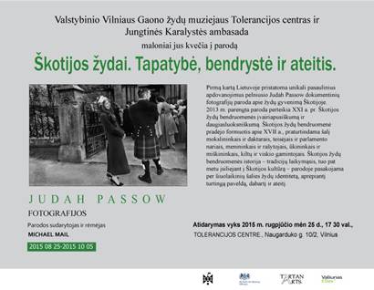 Pirmą kartą Lietuvoje pristatoma unikali pasaulinius apdovanojimus pelniusio fotografo Judah Passow dokumentinių fotografijų paroda apie žydų gyvenimą Škotijoje. 2013 m. parengta paroda perteikia XXI a. pr. Škotijos žydų bendruomenės įvairiapusiškumą ir daugiasluoksniškumą. Škotijos žydų bendruomenė pradėjo formuotis apie XVII a., praturtindama šalį mokslininkais ir daktarais, teisėjais ir parlamento nariais, menininkais ir rašytojais, ūkininkais ir miškininkais, kiltų ir viskio gamintojais. Škotijos žydų bendruomenės istorija – tradicijų laikymasis, tuo pat metu įsiliejant į Škotijos kultūrą – parodoje pasakojama per šiuolaikinių šalies žydų identitetą, aprėpiantį turtingą paveldą, dabartį ir ateitį.