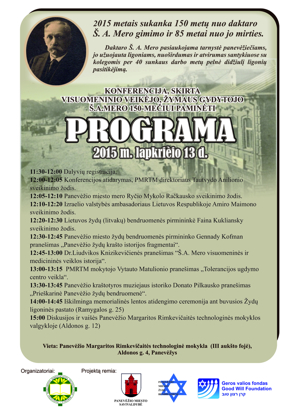 Geros valios fondas ir Panevėžio Margaritos Rimkevičaitės technologinė mokykla lapkričio 13 d. kviečia į konferenciją, skirtą visuomeninio veikėjo, žymaus gydytojo Š. A. Mero 150-mečio minėjimui. Renginį remia Geros valios fondas.