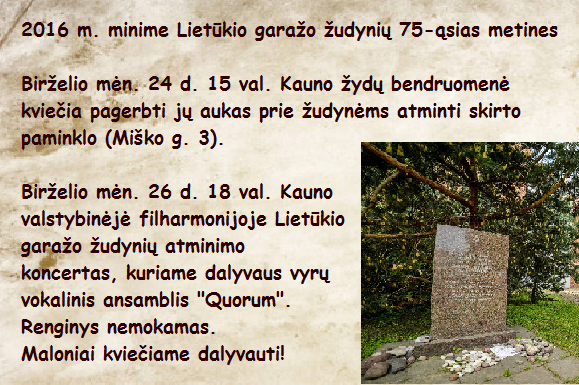 Lietūkio garažo žudynių 75-osios metinės 2016-06-162016-06-27 ← LŽB vaikai kviečiami į vasaros stovyklėlę LŽB R.Savicko dailės mokyklos studentų paroda →