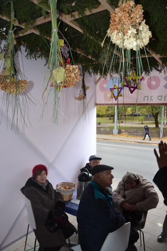 Lietuvos žydų bendruomenės Sukkoto palapinėje – Sukkhoje bendruomenės nariai tradiciškai, kaip ir dera per Sukkotą, susirenka pasikalbėti ir vaišintis. Džiaugsminga Sukkoto šventė tęsiasi 7 dienas. Nuotraukose matyti, kaip švenčia bendruomenės „Abi men zet zich“ senjorų klubas su rabinu. Nepaisant šalto oro, “Beigelių krautuvėlės” Sukkha šventiškai papuošta ne tik lietuviškom gėlėm ir šakom, bet ir Izraelio palmės, gluosnio, mirtos šakomis ir etrogo vaisiumi.