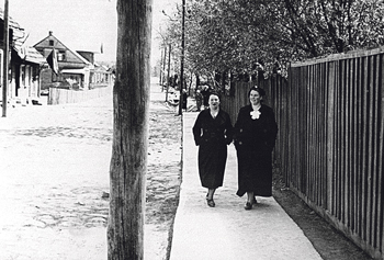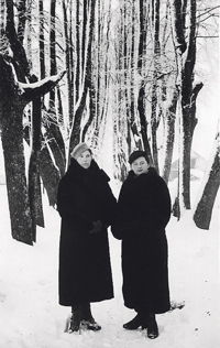 Bičiulės J. Marijampolskaitė (dešinėje) ir E.Kileso žiemą Darbėnų liepų alėjoje 1935–1937 m.