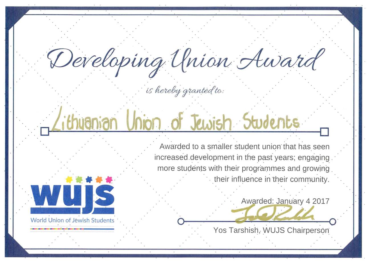 LŽB Studentų sąjunga gavo Pasaulio žydų studentų sąjungos apdovanojimą už plėtrą. Sveikiname! 2017-02-07 ← Sveikiname Aleksandrą Rutenbergą su jubiliejumi! Next Post →