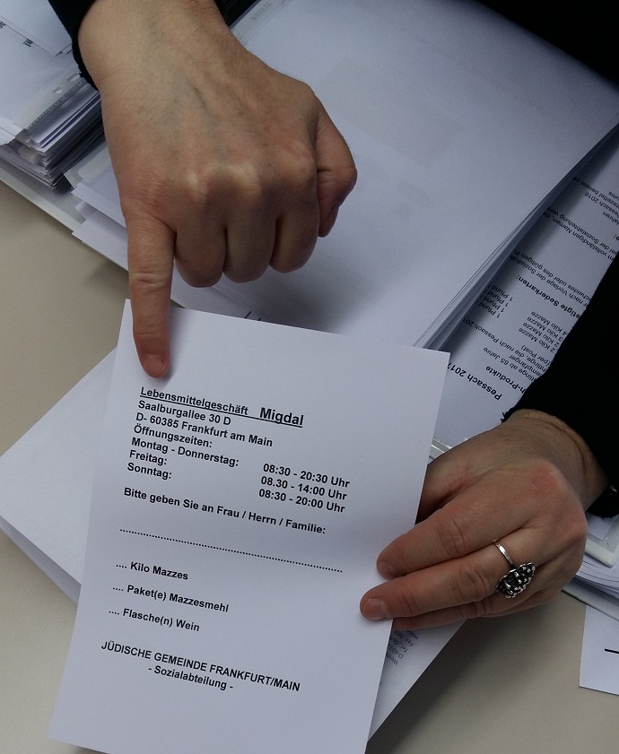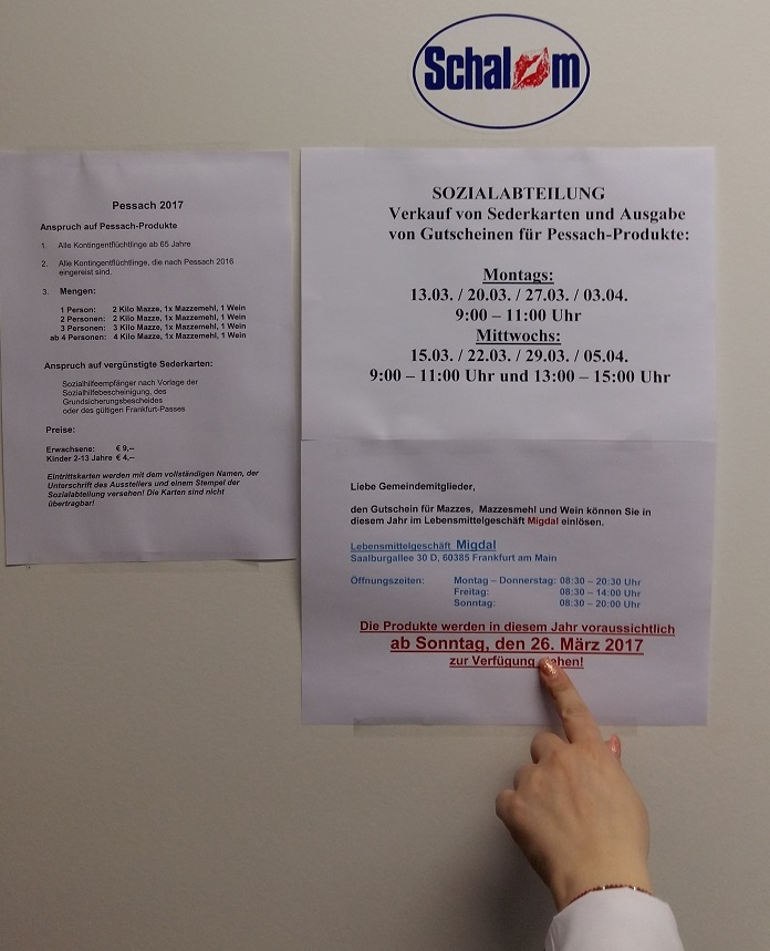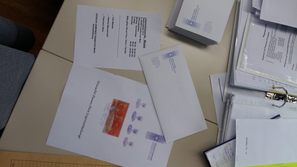 Šiomis dienomis Frankfurto socialinio centro darbuotojai ruošia laiškus savo nariams su šventiniu sveikinimu ir talonu, atsiimti PESACHO paketą, kuriame yra maca, macos miltai ir vynas iš Izraelio. Tokių laiškų bus išsiųsta iki 250. Viso paketo kaina 7,50 EUR. Kvietime pasiimti paketus nurodytas laikas.