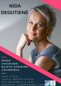 Susitinkame 2017 m. balandžio 11 d. 19:00 stilingoje ir jaukioje Beatos virtuvėje, pačioje Vilniaus širdyje, Gedimino prospekte. Šių metų Pesach šventės metu mes ne tik valgysime gardžią vakarienę, bet patys ją ir gaminsime! Į kulinarinę kelionę mus lydės Nida Degutienė – rašytoja, kulinarė, buvusio Lietuvos ambasadoriaus Izraelyje Dariaus Degučio žmona. Tai ir buvo katalizatorius, paskatinęs rašytoją persikelti gyventi į Izraelį.
