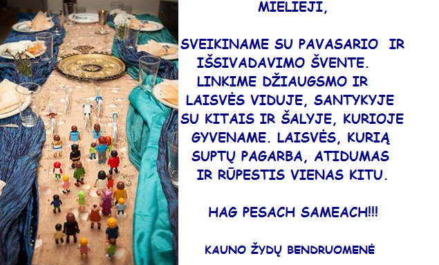 Kauno žydų bendruomenė sveikina su Pesacho švente 2017-04-11 ← Lietuvos žydų (litvakų) bendruomenė sveikina prof. habil. dr. Leonidą Melniką su 60-mečiu! VVGŽM Tolerancijos Centro sveikinimas →