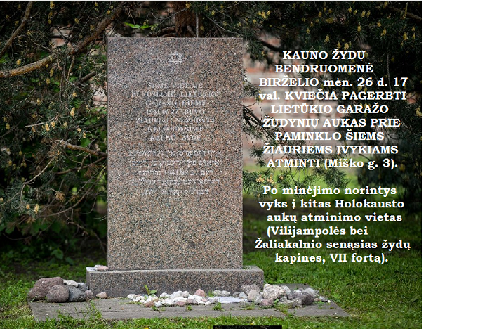 Kauno žydų  bendruomenė  visus kviečia birželio mėn.26d.(pirmadienį)17 val. pagerbti Lietūkio garažo aukas prie paminklo šiems žiauriems įvykiams atminti, Miško gt.3,Kaunas