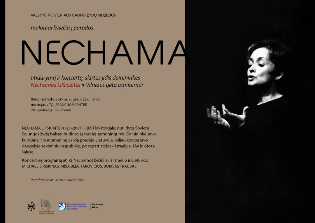 Skambant jidiš melodijoms bus pagerbtas žydų lakštingalos Nechamos Lifšicaitės ir Vilniaus geto atminimas. Rugsėjo 25 d. 18 val. Valstybinio Vilniaus Gaono žydų muziejaus Tolerancijos centre (Naugarduko g. 10/2, Vilnius) bus iškilmingai atidaryta paroda „Nechama”, skirta jidiš lakštingalos Nechamos Lifšicaitės ir Vilniaus geto atminimui. Atidarymo renginio metu skambės jidiš dainos ir melodijos, kurias atliks Nechamos bičiuliai iš Izraelio ir Lietuvos: Michaelis Riskinas, Miša Blecharovičius, Borisas Traubas.