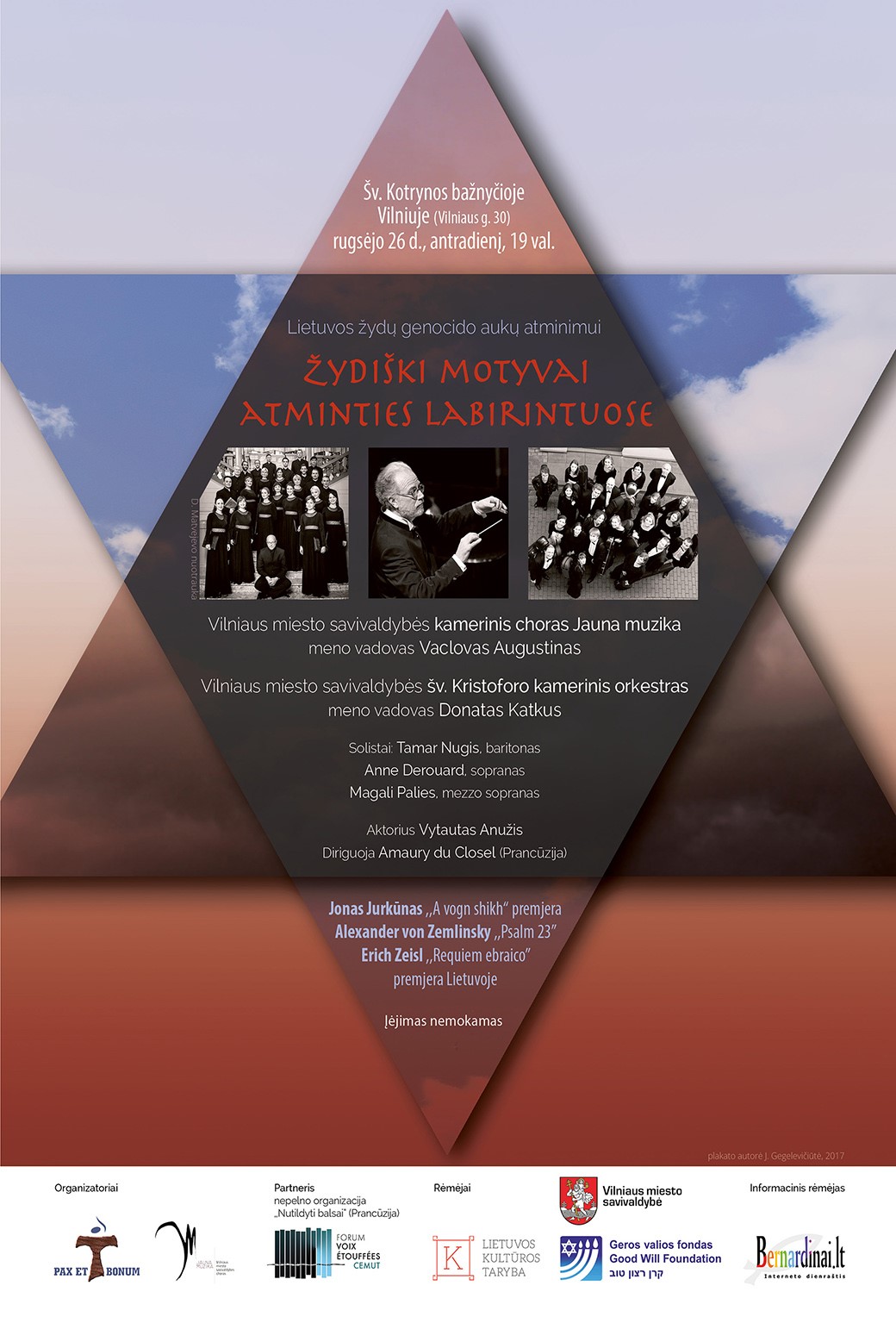 Rugsėjo 26 d. Šv. Kotrynos bažnyčioje kūrinius kartu su Vilniaus miesto savivaldybės choru „Jauna muzika“ ir Šv. Kristoforo kameriniu orkestru atliks solistai Tamar Nugis (baritonas, Estija), Anne Derouard (sopranas, Prancūzija), Magali Palies (mecosopranas, Prancūzija) ir aktorius Vytautas Anužis, diriguos svečias iš Prancūzijos Amaury du Closel. A. du Closeliui rūpi įamžinti per Holokaustą nukentėjusių ar žuvusių kompozitorių atminimą: 2005 m. jis išleido knygą apie Europos kompozitorius, kuriuos 1933–1945 m. naciai nužudė ar ištrėmė (už ją pelnyta Kritikų premija už geriausią muzikinę esė). Dabar dirigentas yra „Nutildytų balsų“ festivalio Strasbūre, skirto Trečiojo reicho persekiotiems kompozitoriams, meno vadovas, taip pat – nuolatinis Tirgu-Murešo (Rumunija) filharmonijos orkestro dirigentas, „Opéra Nomade“ muzikos vadovas, vokalo ir dirigavimo dėstytojas.