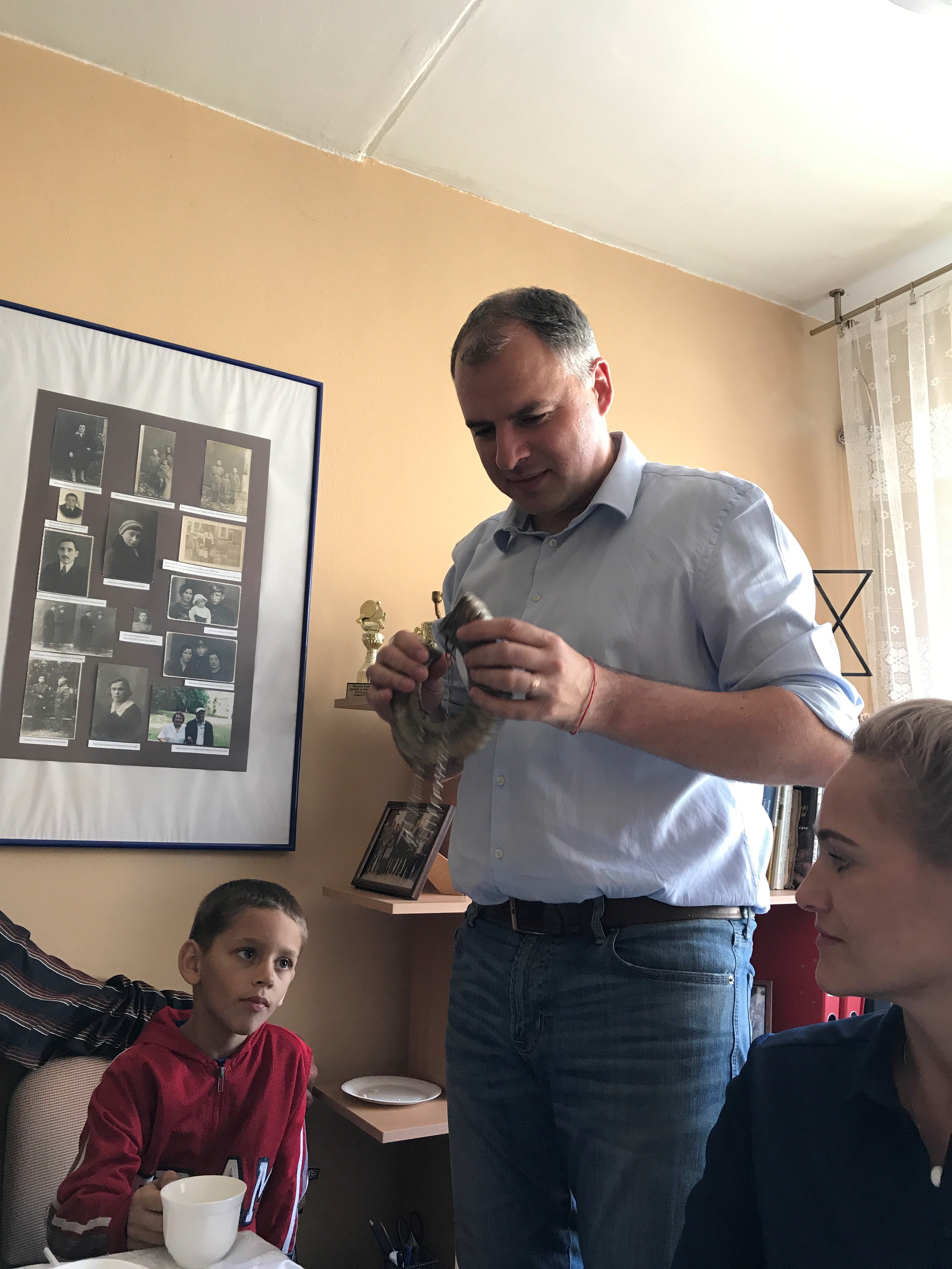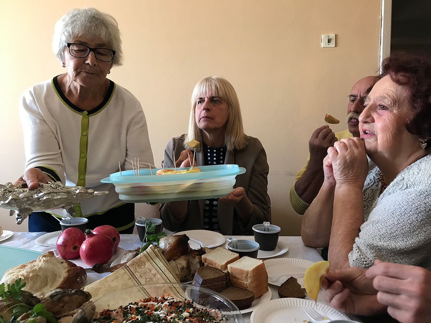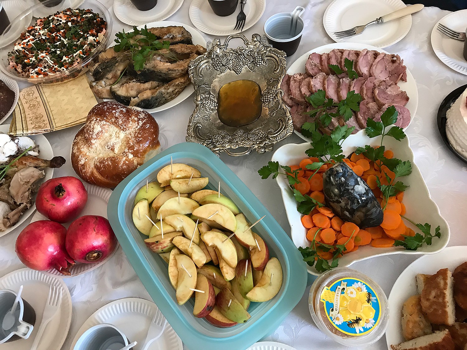 Per Naujuosius Metus rengiama šventiška puota, kurios neatsiejama dalis yra apvali chala (baltos duonos pynutė) ir obuoliai; savo forma šie patiekalai simbolizuoja „apvalų stalą“. Obuolių ir chalos gabaliukai yra mirkomi meduje ir valgomi tradiciškai linkint „gerų ir saldžių metų“. Rytų Europos žydai žuvį patiekia su visa galva ir ją valgo, vieni kitiems linkėdami „būti galvoje, o ne uodegoje“. Šventės metu yra pučiamas šofaras – avino ragas, kurį šventės metu pūtė pirmininkas Artūras Taicas.