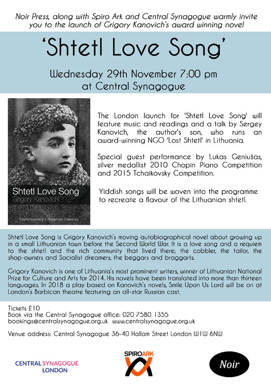 2017 m. lapkričio 29 d. 19 val. Londono Centrinėje sinagogoje bus pristatomas naujausiais Grigorijaus Kanovičiaus kūrinys- autobiografinis apsakymas anglų kalba “Shtetl Love Song”.
