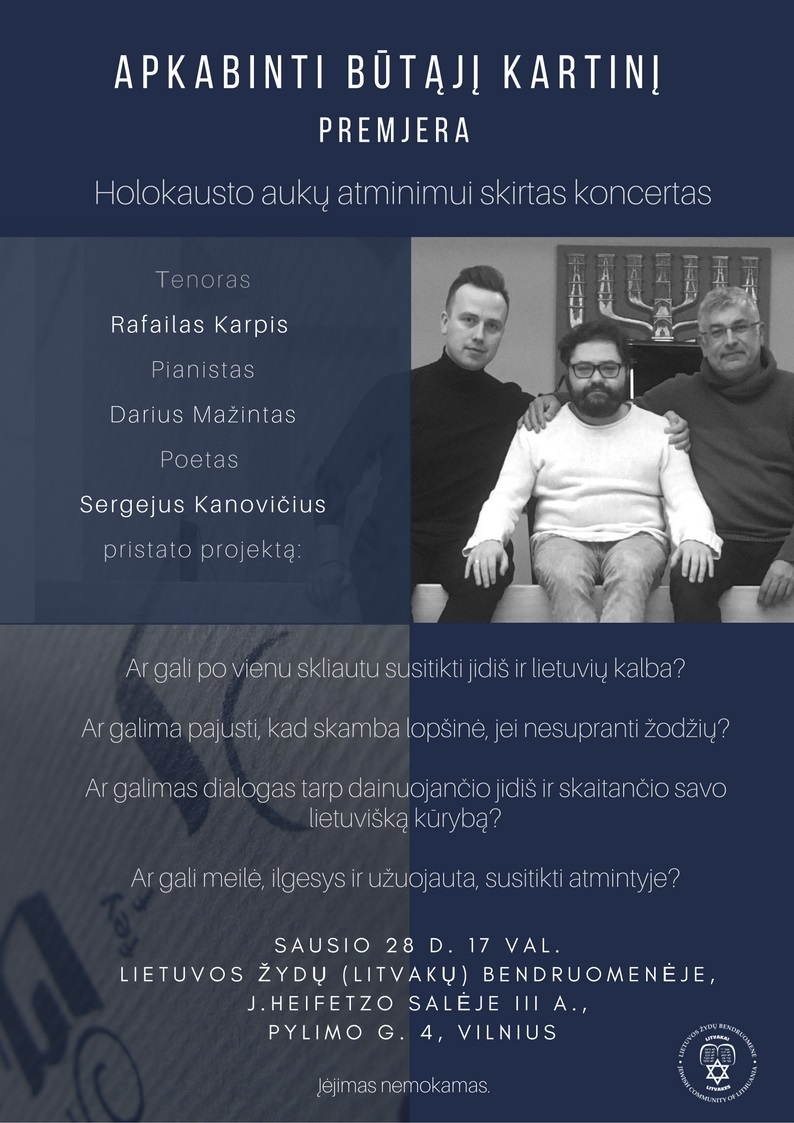 Nuoširdžiai kviečiame visus į Holokausto aukų atminimo dienai skirtą renginį, kurio metu tenoras Rafailas Karpis, pianistas Darius Mažintas ir poetas Sergejus Kanovičius pristatys projektą „Apkabinti būtąjį kartinį”.