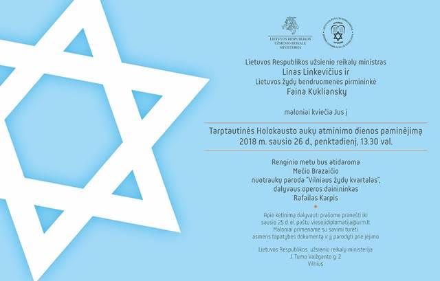 Lietuvos Užsienio reikalų ministras Linas Linkevičius ir Lietuvos žydų (litvakų) bendruomenės pirmininkė penktadienį, sausio 26d. 13.30 val.. kviečia į Užsienio reikalų ministeriją paminėti Tarptautinę Holokausto aukų atminimo dieną. Dalyvaus Holokaustą išgyvenę žydai, taip pat žydų bendruomenės nariai ir žydų gelbėtojai, Seimo nariai, užsienio valstybių ambasadoriai.