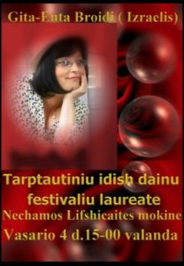 Vasario 4d. Šiaulių Žydų bendruomenėje buvo puikus jidiš dainų vakaras, susirinko gausus būrys bendruomenės narių ir svečių. Visi buvo sužavėti Gitos – Entos Broidi dainų atlikimu jidiš kalba. Svečias iš Kauno Chaimas Bergmanas buvo maloniai nustebęs, kad beveik visi Šiaulių Žydų bendruomenes nariai puikiai kalba jidiš. Po koncerto dar ilgai niekas neskubėjo išeiti, žmonės prie kavos puodelio dalinosi prisiminimais, atlikėja papasakojo apie jos darbą Izraelyje.Tikimės rugpjūčio mėn. kai vyks Žagarės Litvakų suvažiavimas puiki jidiš dainų atlikėja Gita-Enta Broide ras galimybę atvykti ir dar kartą mus džiuginti savo dainomis.