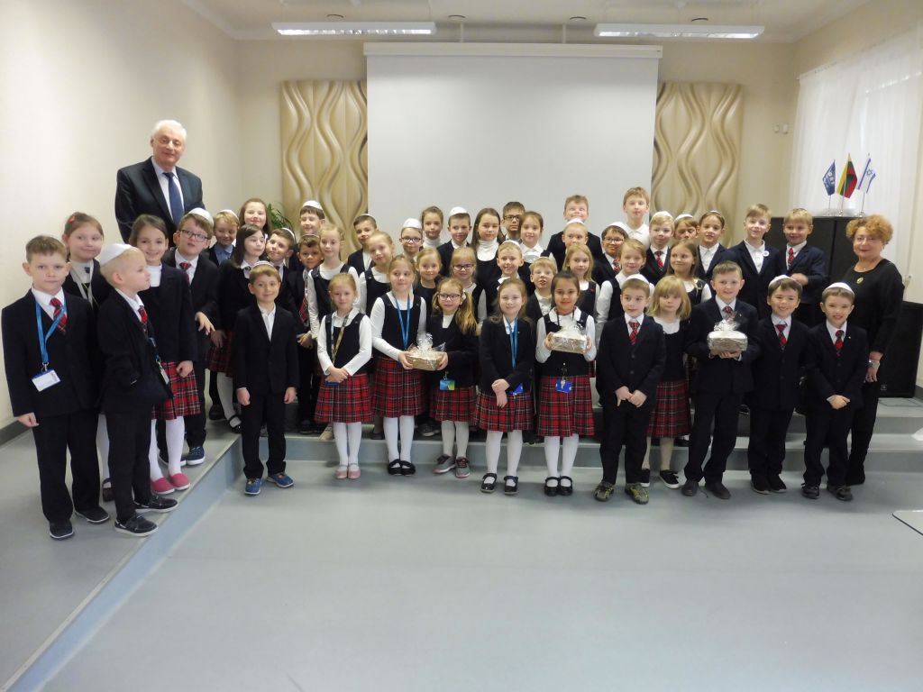 Nuotraukoje matote gimnazijos direktorių Mišą Jakobą su pirmokais.