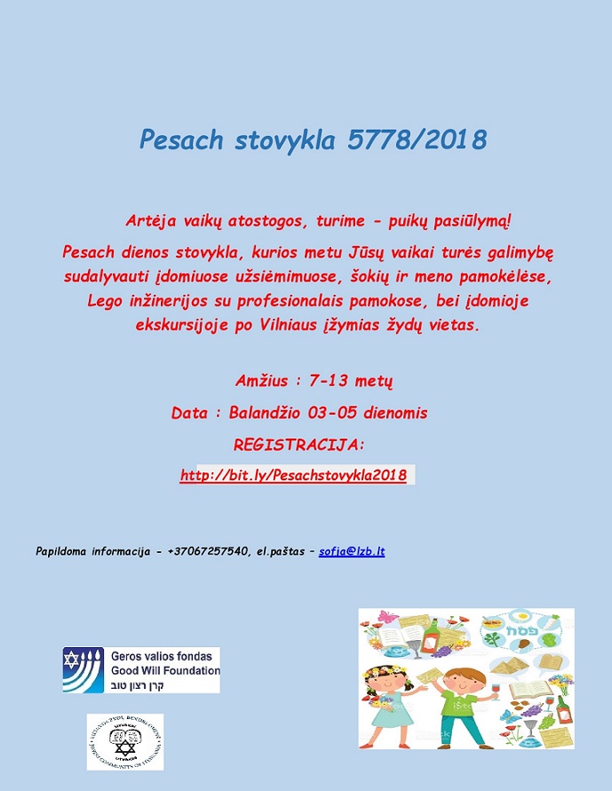 LŽB kviečia vaikus per Pesacho atostogas į dienos stovyklą 2018-04-022018-04-04 ← Institucijos nesusitaria, kur Vilniuje statyti paminklą žydų gelbėtojams LŽB klubas Gešer atšventė Pesacho Sėderį su žydiškom tradicijom (Papildyta nuotraukomis) →