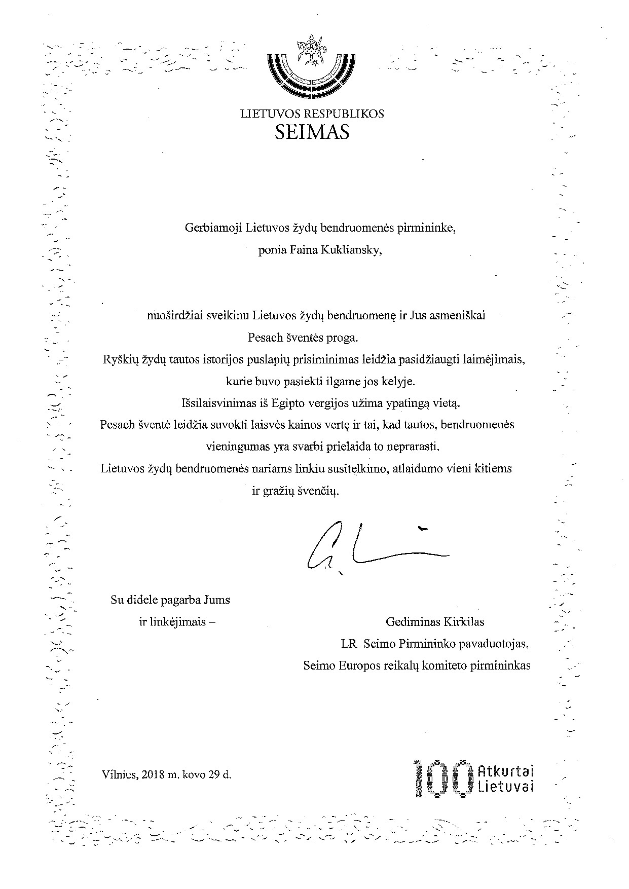 Gedimino Kirkilo LR Seimo pirmininko pavaduotojo sveikinimas Pesacho šventės proga