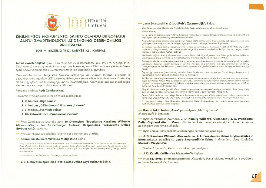 Stipriu emociniu užtaisu ceremoniją papildė trumpas, bet įspūdingas Kauno šokio teatro “Aura” pasirodymas. Atminimo plokštę atidengė J. Zwartendijk sūnus ir dukra garbingoje Nyderlandų karaliaus Willem Alexander, Prezidentės D. Grybauskaitės ir Kauno mero akivaizdoje. Atskiros padėkos nusipelno ir Kauno J. Naujalio muzikos gimnazijos fleitininkės gražia gaida pradėjusios ir užbaigusios įsimintiną įvykį.