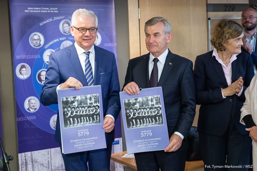 Lenkijos Užsienio reikalų ministras Jacekas Czaputowiczius Ir LR Seimo Pirmininkas Viktoras Pranckietis su Lietuvos žydų bendruomenės 5779 m. kalendoriumi, skirtu Holokausto vaikams.