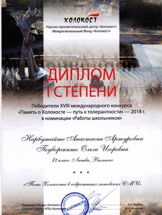 Mokinės įtikinamai atskleidė, kad dauguma Lietuvos žmonių yra tolerantiški ir gerbia Holokausto aukų atminimą bei dalyvauja įvairiuose renginiuose joms pagerbti. Sausio 28 d. Rusijos žydų kongreso organizuotame vakare A.Narbutaitei ir kitiems tarptautinio konkurso nugalėtojams buvo įteikti ,,Holokausto“ centro apdovanojimai. Juos teikė garsi Rusijos žurnalistė ir fondo pirmininkė Ala Gerber. Renginyje dalyvavo ir Lietuvos ambasadorius Remigijus Motuzas.