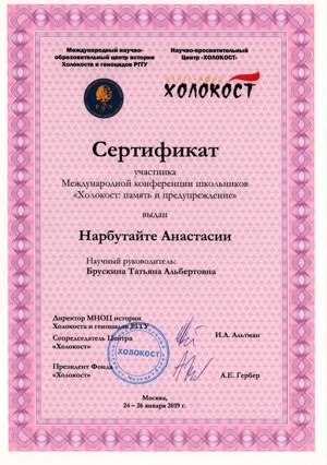 Minint tarptautinę Holokausto aukų atminimo dieną, Lietuvos ambasadoje Maskvoje surengta akcija ,,Mes prisimename“. Kartu su ambasados diplomatais joje dalyvavo Vilniaus ,,Santaros“ gimnazijos anglų kalbos mokytoja ekspertė, 12 c kl. auklėtoja Tatjana Bruskina ir 12 c kl. mokinė Anastasija Narbutaitė, kuri tapo Rusijos mokslo ir švietimo centro ,,Holokaustas“ surengto tiriamųjų ir analitinių darbų konkurso ,,Atmintis apie Holokaustą – kelias į toleranciją“ nugalėtoja. A.Narbutaitė šiame darbe kartu su bendraklase Olga Podvorskyte analizavo Holokausto temos atspindėjimą Lietuvos žiniasklaidoje 2016-2018m. Mokinės išanalizavo straipsnius Holokausto tema Delfi.lt; BNS, Bernandinai.lt; taip pat ir skaitytojų komentarus. Darbe pažymima, kad Lietuva atsiprašė už savo piliečių dalyvavimą žydų genocide. Mokinės remiasi nacionalinės teisės nuostatomis dėl neapykantos kurstymo draudimo, mini, kad neigiami komentarai pašalinimi.