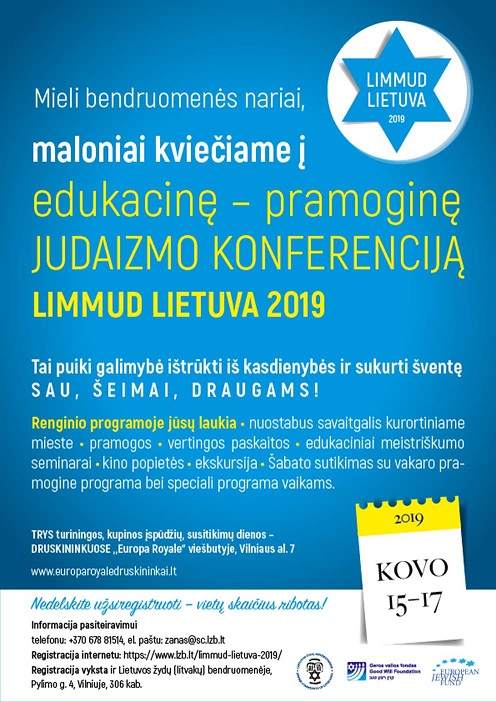 Registracija į LIMMUD 2019 baigėsi! 2019-03-012019-03-08 REGISTRACIJA BAIGĖSI! Dėkojame visiems už aktyvumą kartu tęsiamas gražiausias bendruomenės tradicijas! ← Vaikų auklėjimas tradicinėje žydų šeimoje rusų kalba M. Ivaškevičius – apklausiamas, o R. Pankevičius – neliečiamas: kada antisemitizmo apraiškos sulauks deramo teisėsaugos institucijų dėmesio? →