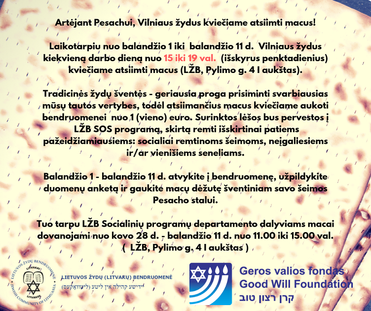 Artėja Pesacho šventė, Vilniaus žydus kviečiame atsiimti macus