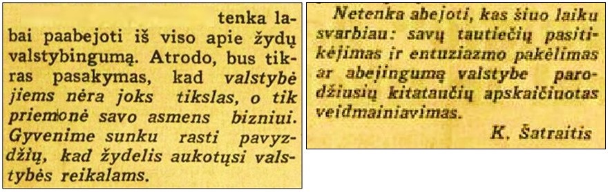 Matome dviejų straipsnių pavadinimus. Kairėje esantis straipsnis – pasirašytas, jo autorius K.Šatraitis, o dešinėje – be parašo, vadinasi, yra redakcinis. Abu liečia žydus.