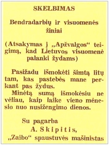 Buvome priblokšti. Savo klausimais skaitytojas-patriotas įvarė mus į kampą: šiame skelbime šūkio „Nepirkite iš žydų!“ tikrai nėra. Bandydami įtikinti savę, kad mūsų virtualus oponentas teisus, tęsėme minėto savaitraščio peržiūrą. Ir staiga … susidūrėme su labai inteligentišku SKELBIMU („Verslas“, 1939/01/20, p. 2):