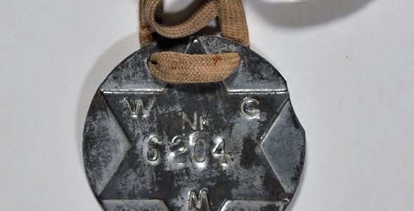 Nuotraukoje kalinio žetonas privalomas nešioti Vilniaus geto kaliniams nuo 1943 m. pavasario.