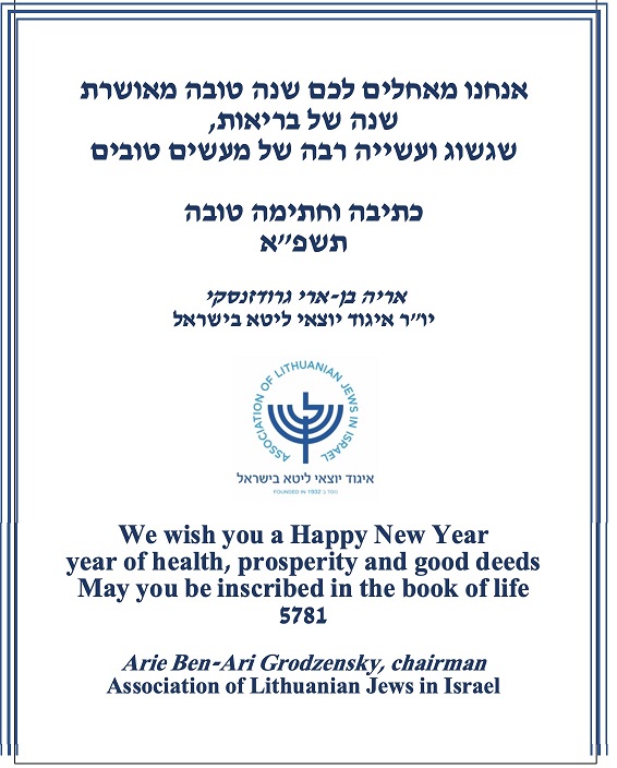 Su Roš Hashana sveikina Lietuvos žydų asociacijos Izraelyje pirmininkas Arie Ben Ari Grodzensky 2020-09-182020-09-23 ← Kviečiame dalyvauti Kvietimas dalyvauti Lietuvos žydų genocido dienos minėjime IX forte →