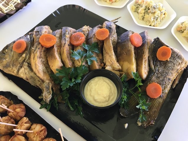 Nors šį kartą šventė nebuvo tradicinė, tačiau tai nesutrukdė   šventiniam staluio patiekti tradicinius žydų patiekalus: chalą, obuolius su medumi, granatas, farširuotą karpį, kapotą silkę bei kepenėles, o taip pat ir tradicinius žydų saldumynus: taigalach ir imberlach.