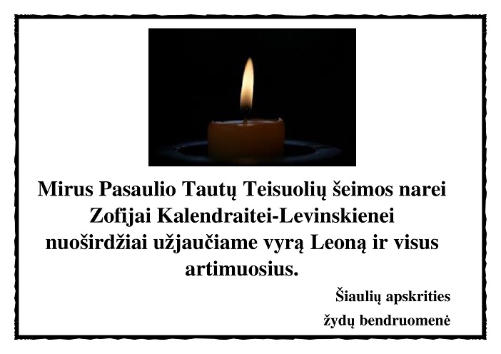 Iš Šiaulių atėjo liūdna žinia – netekome nuostabaus žmogaus -, Pasaulio tautų teisuolės Meilutės Zofios Levinskienės (Kalendraitės). Lietuvos žydų (litvakų) bendruomenė ) reiškia gilią ir nuoširdžią užuojautą Meilutės Zofiijos šeimai : vyrui, vaikams, anūkams seseriai, kuri taip pat yra Pasaulio teisuolė ir draugams.