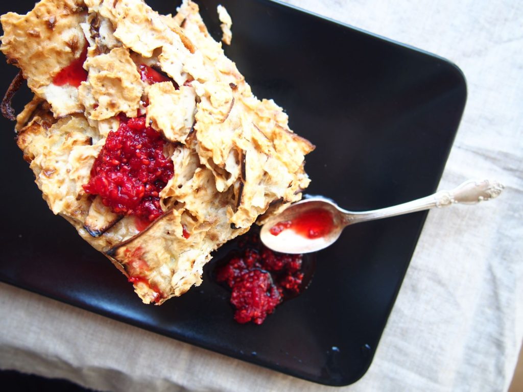 Macų kugelis su aviečių uogiene