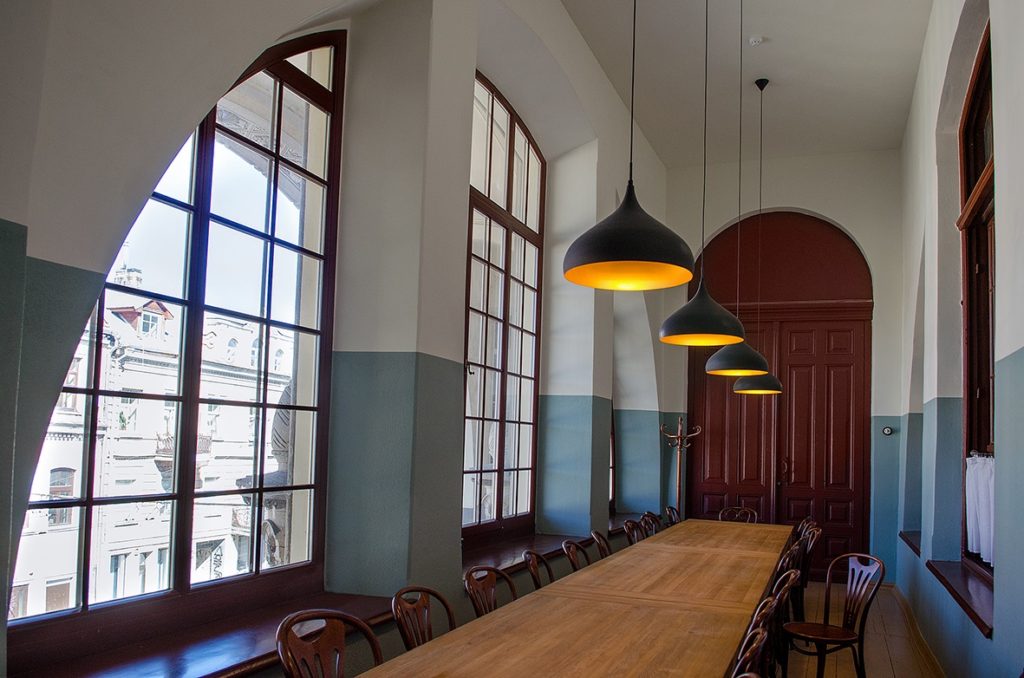 „Aš šią vietą vadinu „trapezine“, tokia lyg valgykla kaip vienuolyne, šventykloje. Tie langai, užuolaidėlės, kurios čia kabojo ir tada, kai stovėjo konvejeris, turi nepaprastą vilnietišką prieskonį, – pasakoja menininkė. – Visiems patiko mano pasiūlytas variantas: kad viena salė turėtų būti skirta virtuvei, kita – valgymui. Stengėmės maksimaliai išlaikyti senovišką dvasią, pavyzdžiui, sienas ne tinkuoti lygiu tinku, o padaryti tokias, kad truputį lyg jaustųsi tinkuotojo pirštai. Specialiai rinkomės ir senovinius elektros jungiklius, ir baldus, kad viskas pritaptų prie bendros sinagogos erdvės.