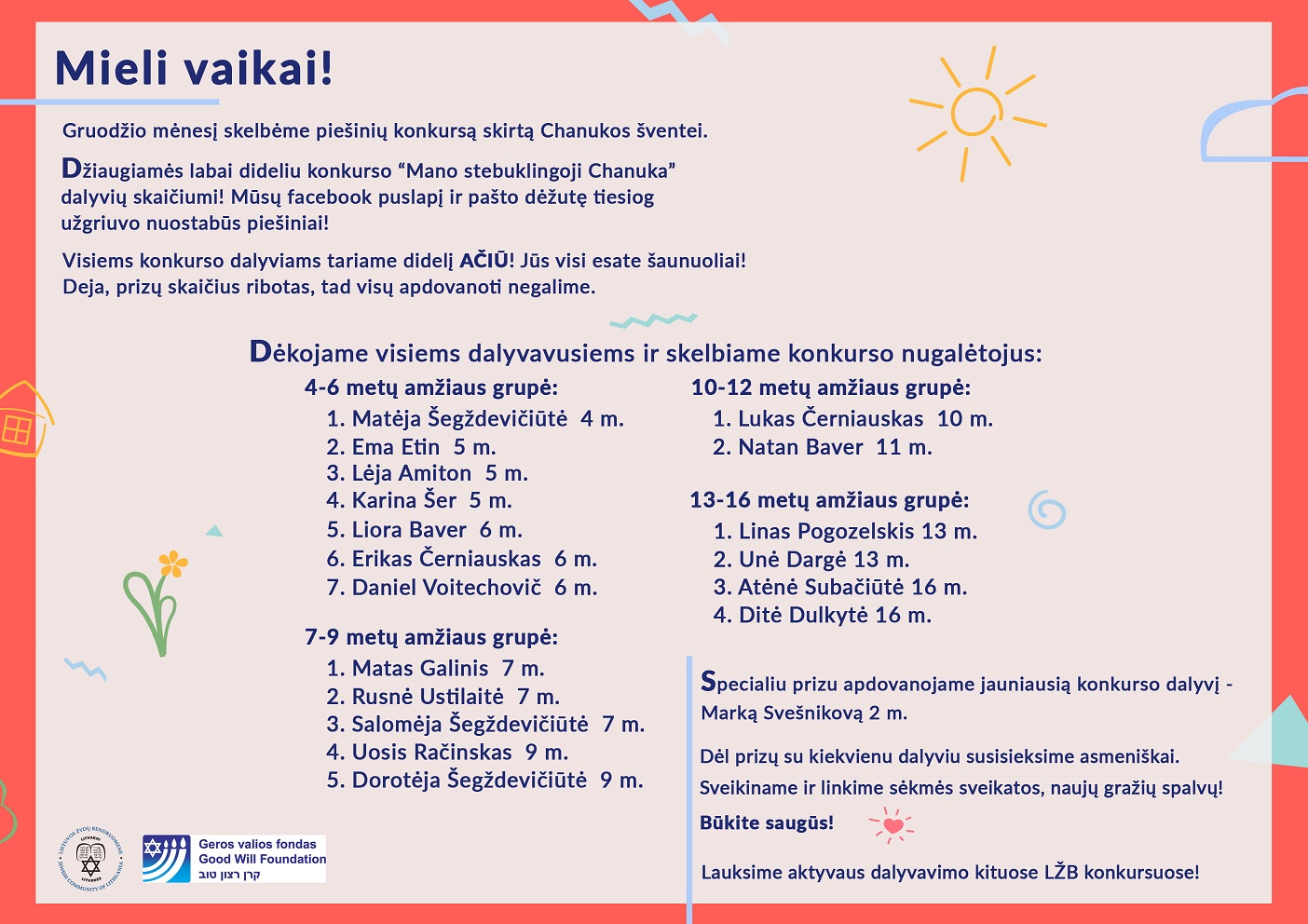 Piešinių konkurso ,,Mano stebuklingoji Chanuka” nugalėtojai 2021-01-122021-01-18 ← #PiešiuLaisvę Kviečiame pradinukus ir jų tėvelius dalyvauti emocinio raštingumo užsiėmime →