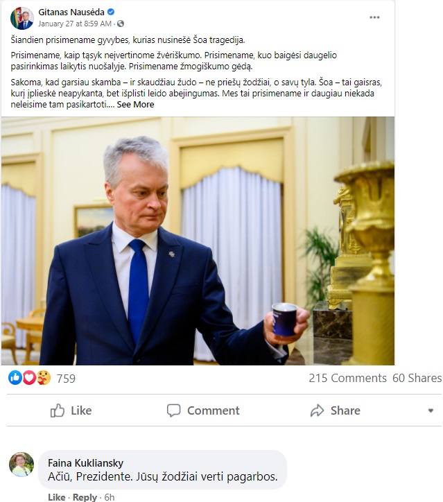 Lietuvos žydų (litvakų) bendruomenės pirmininkė Faina Kukliansky socialiniuose tinkluose dėkoja prezidentui Gitanui Nausėdai už paramą akcijoje #MesPrisimename