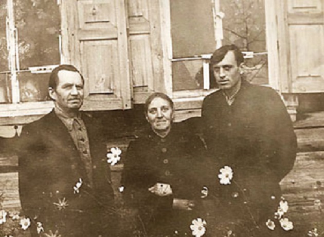Sofija ir Pranas Kasperaičiai su sūnumi Pranu prie savo namų Plotbiščės kaime 1957 m. K. Kasperaitytės-Motužienės archyvas.