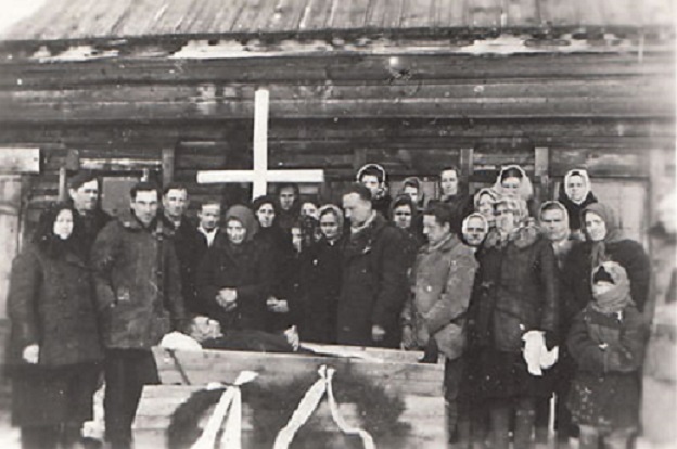 Plotbiščės kaimo lietuviai tremtiniai laidoja pirmąją tremties auką. Antras iš kairės P. Kasperaitis, pirma iš dešinės S. Kasperaitienė su dukra Kazimiera. 1952 m. I. Jablonskio nuotrauka iš jo asmeninio archyvo.