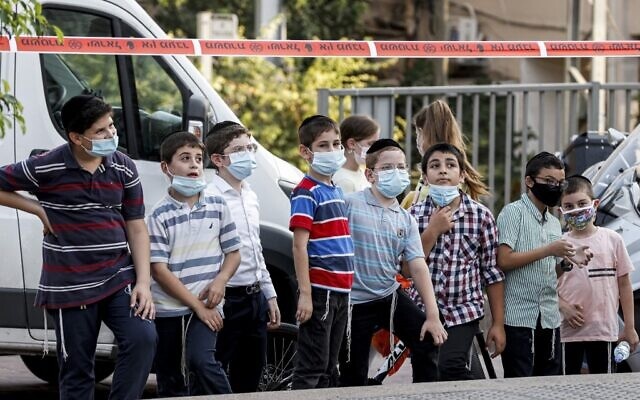 Vaikai su kauke dėl COVID-19 pandemijos, 2020 m. Rugsėjo 6 d. stovi žydų ortodoksų miesto Bnei Brak gatvėje. (Jack Guez/AFP)