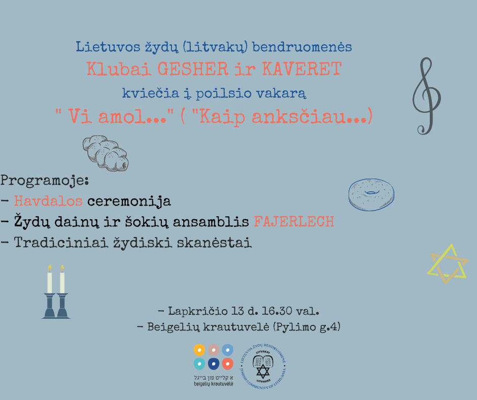 Lietuvos žydų (litvakų) bendruomenės Klubai GESHER ir KAVERET kviečia į poilsio vakarą ” Vi amol…” ( “Kaip anksčiau…) Beigelių krautuvėlėje lapkričio 13 d. 16.30 val.