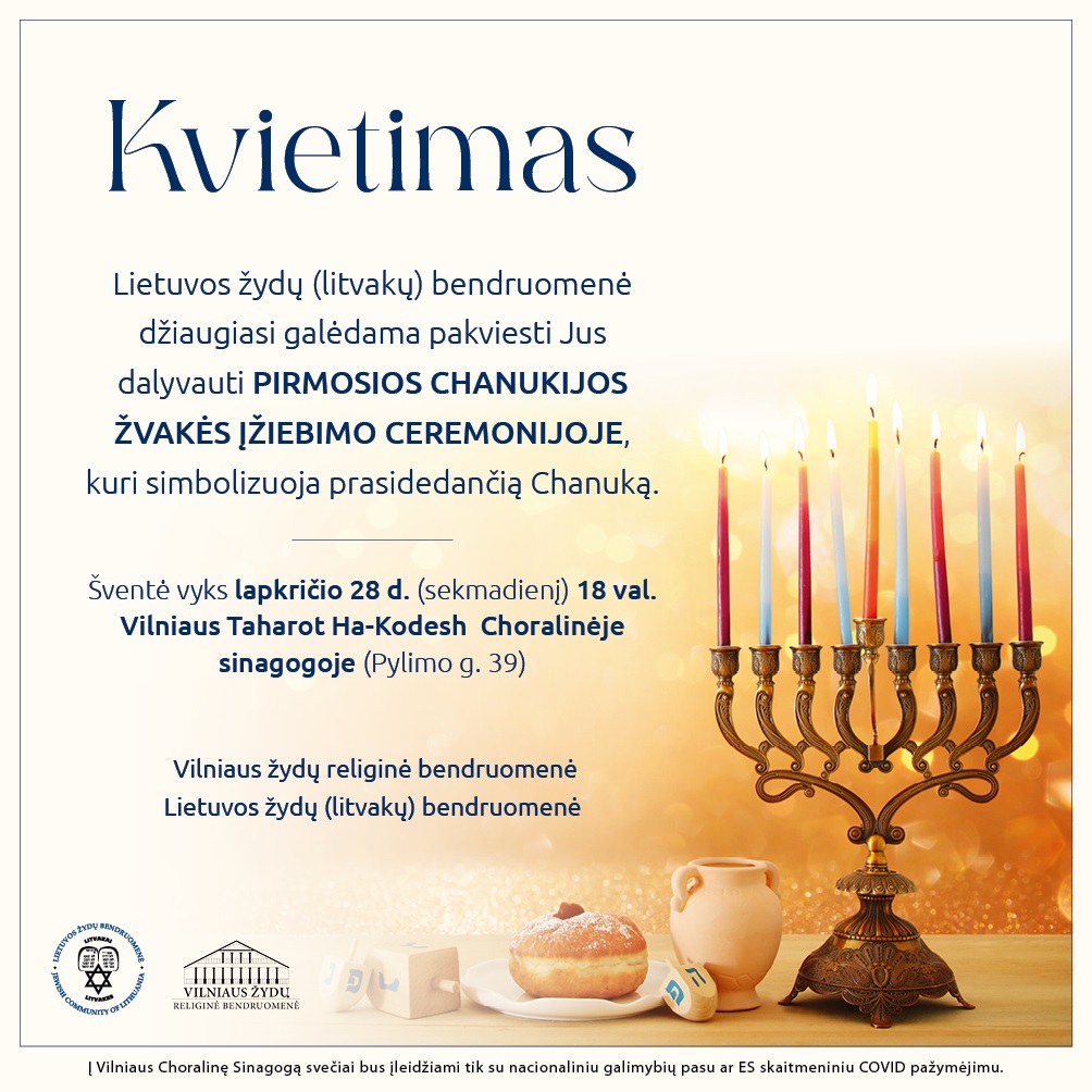 Kviečiame dalyvauti pirmosios Chanukijos žvakės įžiebime 2021-11-272021-11-29 Vilnius žydų religinė bendruomenė ir Lietuvos žydų bendruomenė kviečia dalyvauti pirmosios Chanukijos žvakės įžiebimo ceremonijoje. Maloniai prašome registruotis >>https://bit.ly/3HKk5V6 ← Premjerė: kiekviena Holokausto auka yra asmeninė tragedija Chanukos sveikinimai →