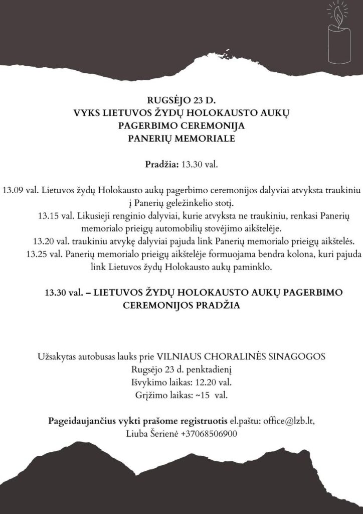 RUGSĖJO 23 D. 13.30 VAL. VYKS LIETUVOS ŽYDŲ HOLOKAUSTO AUKŲ PAGERBIMO CEREMONIJA PANERIŲ MEMORIALE