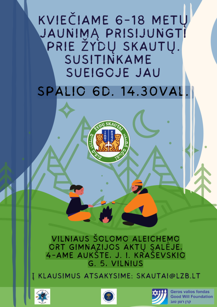 Pirmoji žydų skautų sueiga 2022-10-03 Kviečiame 6-18 m. jaunimą prisijungti prie žydų skautų! primoji sueiga jau spalio 6 d., 14.30 val. Vilniaus Šolomo Aleichemo ORT gimnazija aktų salėje! ← Lietuvoje vieši Europos Komisijos kovos su antisemitizmu ir žydų gyvenimo puoselėjimo koordinatorė Katharina Schnurbein Užuojauta →
