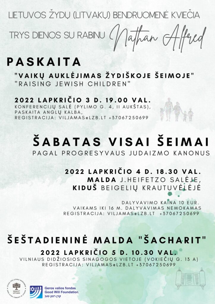Trys dienos su Rabinu Nathan Alfred (anglų kalba) 2022-10-262022-10-26 Gerbiamieji, kviečiame į susitikimus su Rab. Nathan Alfred! ← Sveikinimas Prienų malūnininko Bagranskio šeimos istorija →