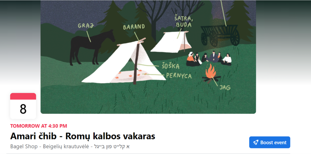 Renginys vyks lapkričio 8 d., 17:30 val., Lietuvos žydų bendruomenės kavinėje “Beigelių Krautuvėlė”, (Pylimo g. 4). Renginys nemokamas. Renginio metu bus dalinami vaikų sukurti atvirukai su trumpu romų-lietuvių kalbų žodynėliu.