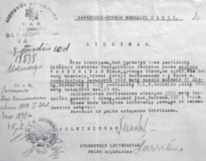 1-ojo Gedimino pulko eilinis (1898-nežinoma) apdovanotas 1-ojo laipsnio Vyties Kryžiumi Nr. 66.