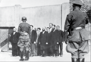 Žydų vyrai Šiaulių gete prie „baltosios sienos“ atrenkami egzekucijai. Šiame gete glaudėsi ir Elijošius Zislė. 1941 metų birželis / Yad Vashemo muziejaus Jeruzalėje nuotraukų archyvas