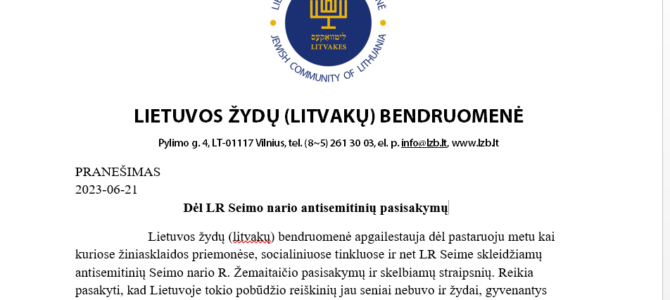 Lietuvos žydų (litvakų) bendruomenė apgailestauja dėl pastaruoju metu kai kuriose žiniasklaidos priemonėse, socialiniuose tinkluose ir net LR Seime skleidžiamų antisemitinių Seimo nario R. Žemaitaičio pasisakymų ir skelbiamų straipsnių. Reikia pasakyti, kad Lietuvoje tokio pobūdžio reiškinių jau seniai nebuvo ir žydai, gyvenantys Lietuvoje, praėjus 80 metų po Vilniaus geto likvidavimo, tikėjosi, kad ir nebebus. Juo labiau, vykstant karui Ukrainoje, kai žmonės, sudarantys tautinę mažumą, agresoriaus gali būti panaudoti kaip įrankis socialiniams konfliktams ir visuomenės skaldymui.