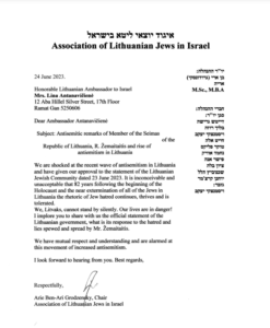 Žydų išeivių iš Lietuvos Izraelyje asociacija, dėl antisemitinių Seimo nario Žemaitaičio pasisakymų ir augančio antisemitizmo Lietuvoje, laišku kreipėsi į Lietuvos ambasadorę Izraelyje Liną Antanavičienę, prašydami paaiškinti oficialią Lietuvos valstybės poziciją šiuo klausimu. Pridedame visą kreipimąsi.